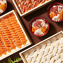 平素よりご愛顧いただいております、紅ズワイガニ・いくら(ますこ)の提供方法ですが、これまでの大皿提供でお好きな量をお取りいただくスタイルを止め、紅ズワイガニは小皿盛りでの提供、いくら(ますこ)はご飯とご一緒にお召し上がりいただくミニイクラ丼としてご提供いたします。